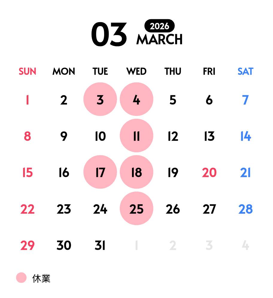 3月営業日のご案内です。 今月も毎週水曜日と、第1火曜、第3火曜は定休日とさせていただきます。 祝日の3月2...